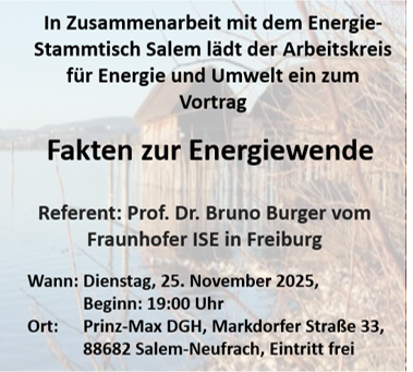 Der Energiestammtisch Salem besteht seit dem September 2022. Er ist eine offene, parteiunabhängige Initiative von Bürgerinnen und Bürgern aus Salem und Umgebung. Hier treffen sich monatlich Menschen mit eigenen Erfahrungen im energetischen Bereich, Interessierte an Themen der nachhaltigen Energie und Energieeinsparung sowie Berufsexperten.