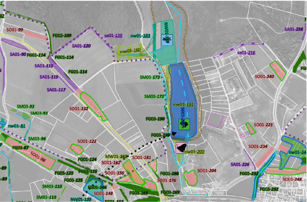 Die neue Planung setzt hier an und folgt einem mehrstufigen, deutlich differenzierteren Ansatz. Zunächst wurde ein aktueller Bestandsplan erstellt, der auf umfangreicher Datenrecherche, der Definition von Zielarten sowie der Integration neuer Biotopkartierungen basiert. Ergänzend wurden zahlreiche Flächen vor Ort überprüft und faunistische Kartierungen durchgeführt, um bekannte Artvorkommen zu berücksichtigen. Darauf aufbauend konnten Schwerpunktbereiche und Verbundachsen identifiziert werden, die für den Austausch von Arten und die Vernetzung von Lebensräumen besonders wichtig sind.